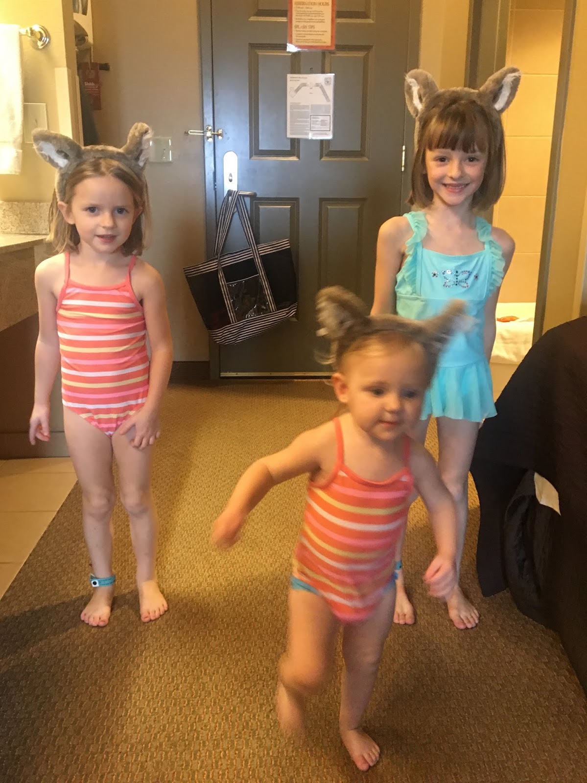 Chick fil A lunch in our bellies, wolf ears on and Suits in suits...ready for the water park!